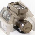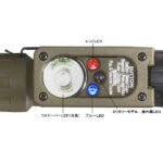 総重量わずか68g。リチウム乾電池(CR123A)わずか1個で100時間以上点灯。リチウム乾電池は軽いばかりではなく、低温性能や保存性にも優れています。ミリタリーモデルには白色のC4スーパーLEDと赤外線、赤、青色LEDが装備されています。それぞれのLEDには4段階調光と点滅機能があり、合計20通りの点灯モードが選択できます。誤色信号の発信を防ぐために、セレクターリングを引いてロックを解除し、点灯させるLED色を設定する構造になっています。中心のプッシュスイッチを長押しすると、最弱→弱→中→強と光量が変化します。ミリタリーモデルは調光機能が最弱から始まる事により、暗闇での眩惑防止と最小限の光で信号発信が可能です。ダブルクリックにより点滅(100%)モードとなります。